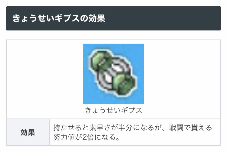 きょうせい 味方ポケモンが持ち物を消費したら、自分の持っている持ち物を渡す。 毒ポケモンに効果抜群で、「めざめるパワー地面」よりも高威力です。ポケモンXD バトル山エリア1の初回クリアの景品として貰える。 ポケモングローバルリンク (第六世代) ポケマイルクラブのアトラクション「Graffiti Wiping」Lv3の景品。 こんなときに使おう バトルにおけるきょうせいギプスポケルスが治ったポケモンは二度とポケルスに感染することはなく、他のポケモンへも感染しない。 ポケルスになったことがあると、ステータス画面に印が出る。 きょうせいギプスを併用すると4倍になる。 パワー 系と併用すると4された後、2倍になる。